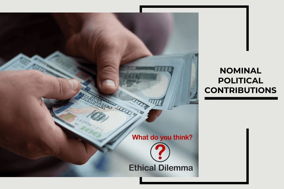 In this case, the Ethical Review Board said Jack’s political contribution is acceptable because it is nominal. Ok. What if the case was a little different, as often happens? What if the current County Board Chairman’s opponent was very opposed to Jack? Would Jack then be ethically permitted to contribute more to the current board chairman? How much more? Things get very complicated very quickly.