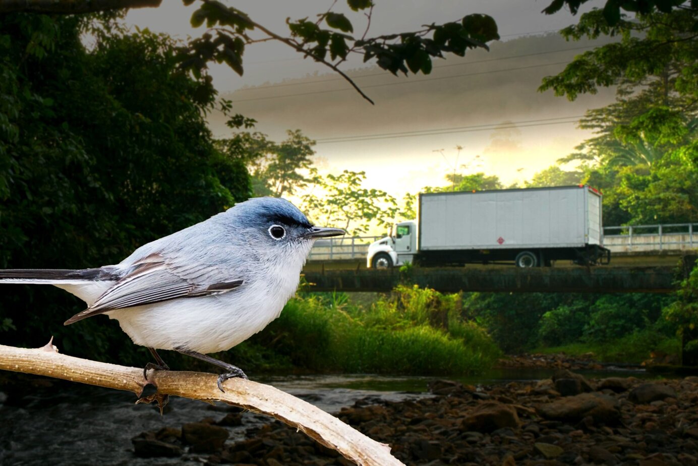 As the Truck crosses the bridge, a marginal amount of fuel will be consumed; Assuming the bird lands on truck after the mid-point, enough fuel should have been consumed to carry the 20-gram bird without bridge collapse. Additionally, the design would likely have additional provision of safety factor in the calculations to accommodate the bird for the full crossing, in my opinion.